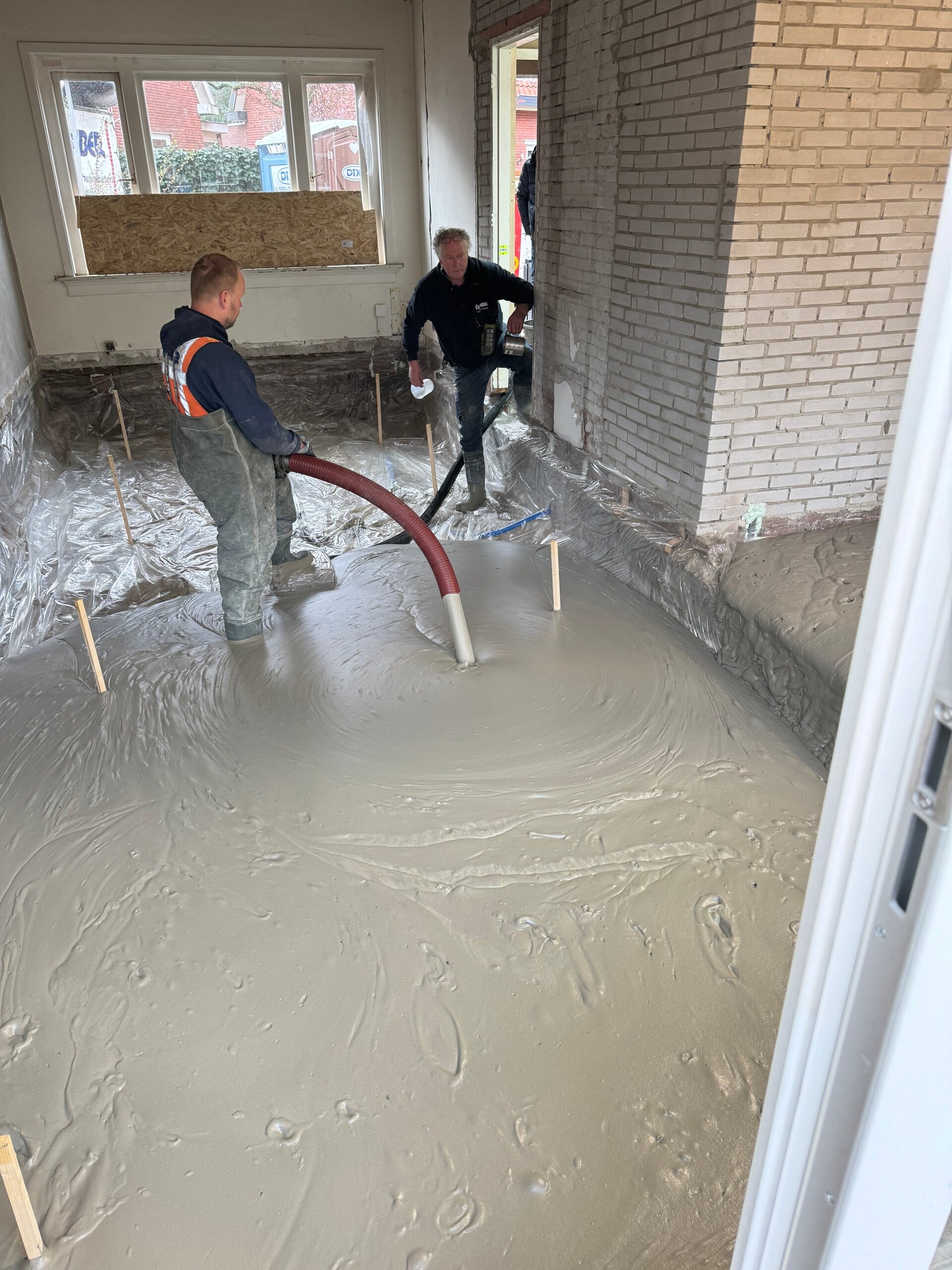 De oude houten vloer en balken, die in slechte staat verkeerden, zijn verwijderd. Vervolgens is er schuimbeton gestort om een stevige en goed geïsoleerde basis te creëren. Hierin is vloerverwarming aangelegd, die zorgt voor gelijkmatige warmte in de hele woonkamer. Op de vloer is een prachtige visgraatvloer gelegd die perfect past bij de stijl van de woning. In de gang is de originele granitovloer opnieuw aangebracht, nu met het extra comfort van warme voeten.